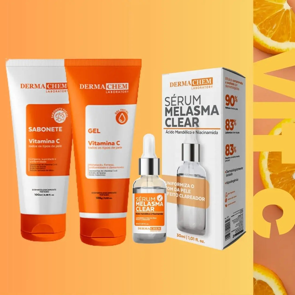 Kit 3 Skincare Vitamina C Clareador Dermachem - Sérum Melasma Clear Efeito Clareador / Gel Facial Anti-Idade / Sabonete Facial Vitamina C